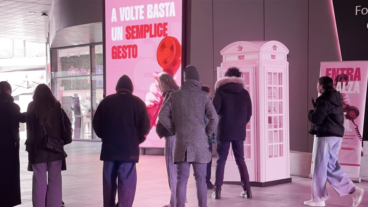 In Piazza Tre Torri, la Cabina Rosa a sostegno del numero antiviolenza e antistalking 1522 ha richiamato centinaia di persone, guidate da una spettacolare domination degli schermi Mediamond che, come un filo luminoso, accompagnava i passanti fino all’installazione.